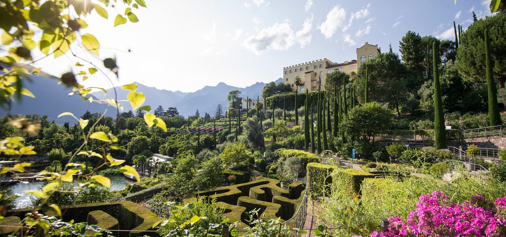 Mit mehr als 80 bunten Gartenlandschaften aus aller Welt präsentiert Schloss Trauttmansdorff eine Kombination aus exotischer und mediterraner Vegetation. Das gesamte Areal ist zwölf Hektar groß, wobei ein raffiniertes Netz aus fast 6 km langen Spazierwegen durch die Gärten führt. Weiters erwarten Sie ein wunderschönes Amphitheater und verschiedene Künstler-Pavillons. Außerdem lohnt sich ein Blick auf die seltenen Attraktionen: ein 700-jähriger Olivenbaum, die größte und älteste Rebe der Welt, ein Seerosenteich, eine Abenteuerbrücke, ein Mosaik der Gesteinswelt und natürlich zahlreiche exotisch-mediterrane Blumen- und Pflanzenlandschaften. Neu in diesem Jahr ist die „Botanische Unterwelt“, in der Sie einen Einblick in die mystische und unterirdische Welt der Pflanzen bekommen. Im Schloss selbst findet sich das „Touriseum“, welches seine Besucher über die Südtiroler Tourismusgeschichte informiert.